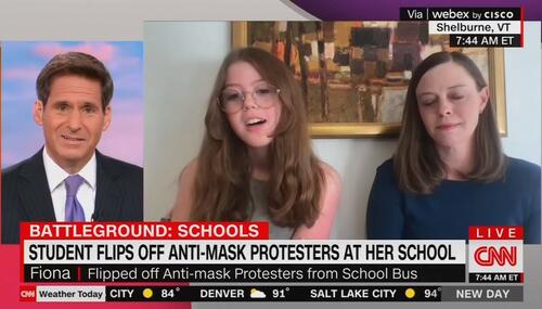 Just as the media were delighted by a liberal bicyclist who flipped off President Trump’s motorcade a few years ago, CNN was mooned over this morning by a teenager who showed the same foul hand gesture to anti-mask parents outside her school.