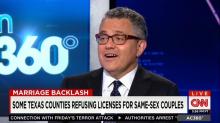 On Monday's Anderson Cooper 360, Jeffrey Toobin maintained that the comparison between bans on interracial marriage and gay marriage is “exactly a parallel situation.” After Cooper asked whether officials, in a hypothetical situation, could deny licenses to interracial couples if they had a religious objection, Toobin asserted: “Ted Cruz was asked that exact question today by Savannah Guthrie on the Today show and he ducked it.”