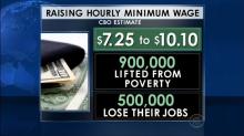 The CBO report was released Tuesday afternoon and estimated that the wage increase would boost 900,000 Americans above the poverty line but would also result in the loss of half a million jobs. CBS was the only network to report the news; neither NBC nor ABC touched on the CBO report.
