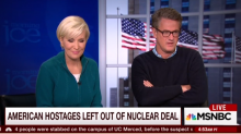 Thursday’s Morning Joe featured a discussion on the Iranian deal and hostages in Iran. Late into the segment, Mika Brzezinski inquired of Vali Nasr on whether he was surprised the hostages weren't part of the deal. Nasr, who served as a State Department official in the Obama administration, and Karl Vick, of Time Magazine, both expressed a lack of surprise for getting the hostages. Joe Scarborough, infuriated by the lack of suprise, began to criticize the idea of dealing with the Iranians.