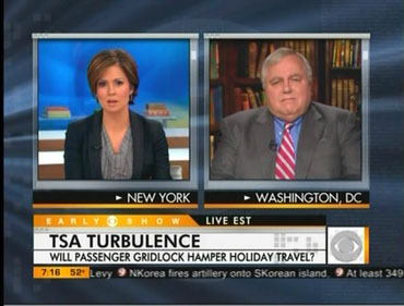 Parroting the TSA chief's talking points, the CBS anchor failed to question Goelz, former managing director of the National Transportation Safety Board, about the potential for civil liberties abuses. Instead, CBS displayed graphics hyperbolizing "TSA Turbulence" and fretting "Will Passenger Gridlock Hamper Holiday Travel?"