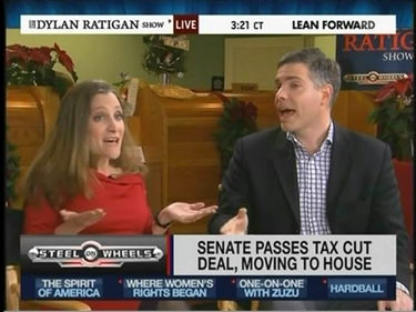 For Chrystia Freeland, the thought of only taxing wealthy estates 35 percent is "destructive to the fabric of America." The Reuters global editor-at-large went on a ear-piercing tear this afternoon on MSNBC's "Dylan Ratigan Show," stoking the flames of class warfare.