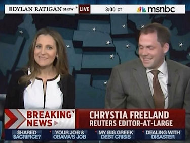 Chrystia Freeland made a series of bizarre statements on MSNBC today that were overshadowed only by Anthony Weiner's contrite presser during which the Democratic congressman admitted to tweeting the infamous crotch photo and lying to cover it up.
