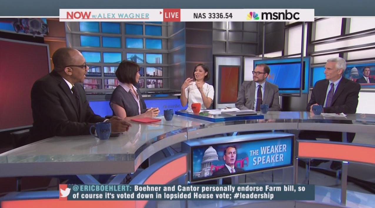 Alex Wagner appeared positively giddy over the House of Representative’s failure to pass the farm bill Thursday, using the bill’s defeat as an opportunity to rail against John Boehner and the House Republican caucus on Friday’s Now.