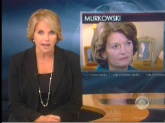 On Monday’s CBS Evening News, anchor Katie Couric filed a report on Senator Lisa Murkowski in which she highlighted the Alaska Republican’s criticism of the Tea Party movement requiring a "purity test," and of Sarah Palin being "not worldly enough" to be President. After describing Murkowski as "one of a dying breed of moderate Republicans," without noting that Tea Party Republican Joe Miller was dragged down by personal scandal, Couric passed on that "Murkowski claims she’s winning because she represents all Alaskans."