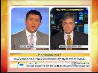 As Thursday's Today show on NBC gave attention to GOP presidential candidate Newt Gingrich's support for allowing some illegal immigrants to gain legal residency status rather than face deportation, substitute co-anchor Carl Quintanilla asked correspondent John Harwood if the former House Speaker was "pandering" to gain votes in the general election. Quintanilla: