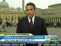 On Monday's Good Morning America, as ABC's Jeffrey Kofman recounted the news that Pope Benedict XVI's butler has been arrested, implicated in leaking Vatican documents to the media, the ABC correspondent asserted that the Pope's "seven-year papacy has been consumed by very public scandals," and then recounted a group of demonstrators who recently accused the Pope of "covering up evidence" in the case of a 15-year-old girl who went missing in 1983. Kofman: