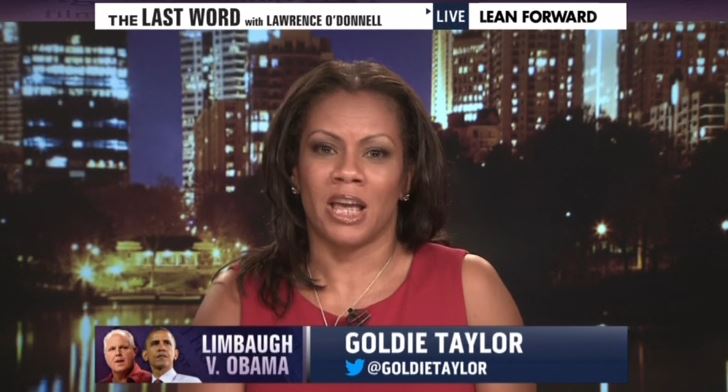 Appearing on Monday's The Last Word, MSNBC contributor Goldie Taylor called Rush Limbaugh "dangerous," and accused him of "pimping his audience" in response to the conservative talk radio host's reaction to President Obama's statement on the George Zimmerman verdict. After a clip of Limbaugh, Taylor responded: