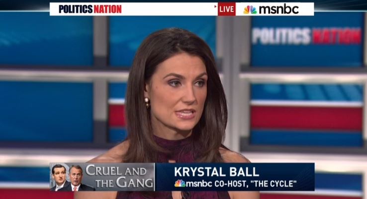 Appearing as a guest on Thursday's PoliticsNation, during a discussion of the government shutdown, MSNBC's Krystal Ball characterized congressional Republicans as "tak[ing] the whole government hostage," and "threaten[ing]" the "constitutional balance."
