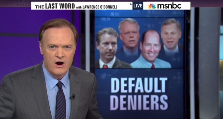 Taking off on the terms 'Holocaust deniers" and the more recently dubbed "global warming deniers," the words "Default Deniers" appeared on screen behind the MSNBC host as he began the show: