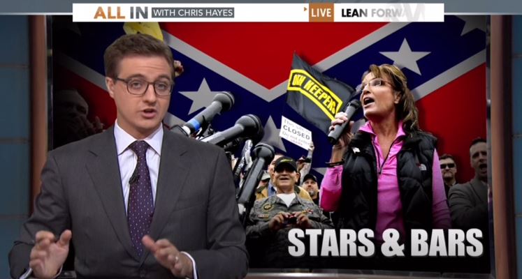 HAYES: We're talking about this big Tea Party rally that happened on the mall this weekend, yesterday actually. It was called the Million Vet March. It was billed as an apolitical celebration of America's veterans and indignation at the fact that the memorial was closed down, but then it just became the big Tea Party rally, guys with flags and quite famously by now, this iconic photo, if we have it, of a guy in front of the White House with a big Confederate Flag. My question to you is, is it fair to show this and be like, this represents something about what these folks, where these folks are coming from?