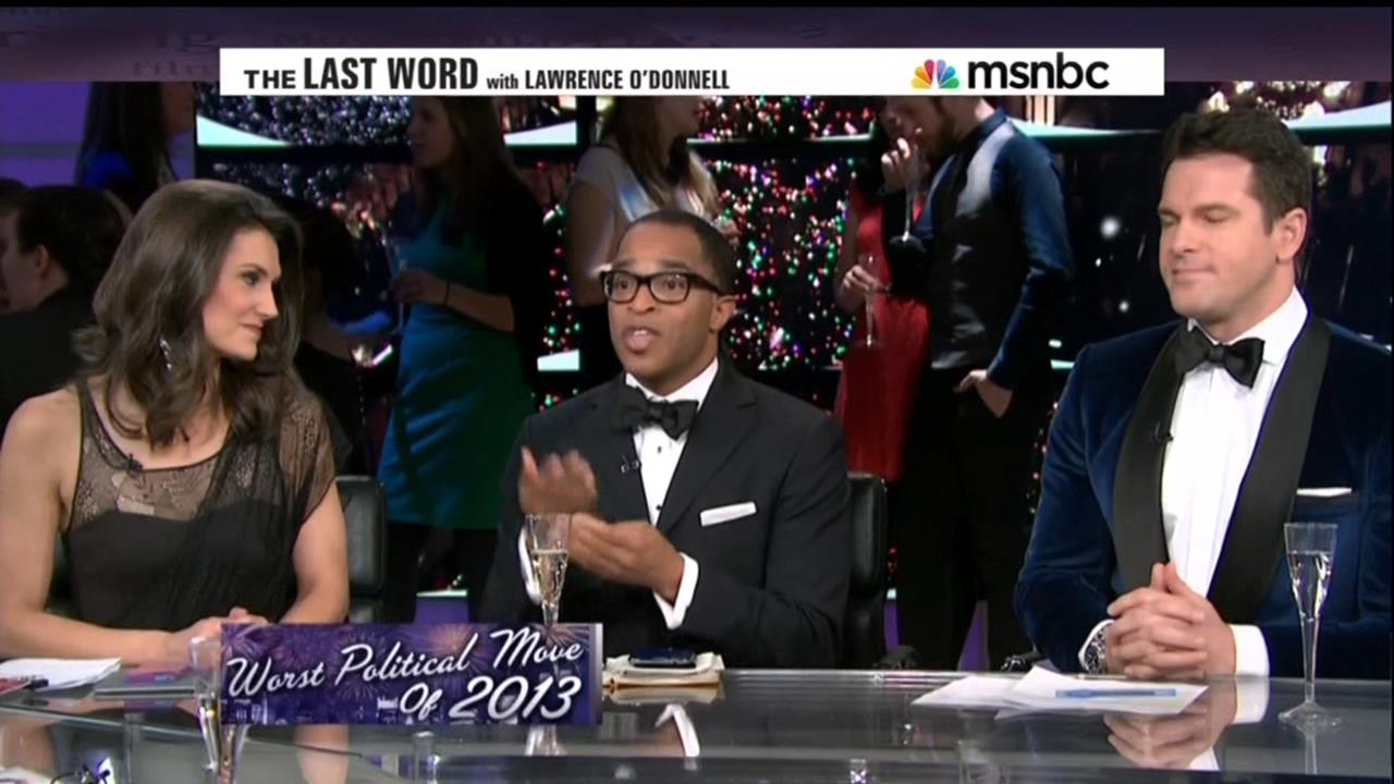 The special edition of the show assembled a panel of MSNBC regulars to assign awards in a number of categories for the year 2013. Picking up on the fact that Capehart had cheated in the first part of the segment by having two answers, host O'Donnell posed: "And, Jonathan Capehart, your two worst political moves?"