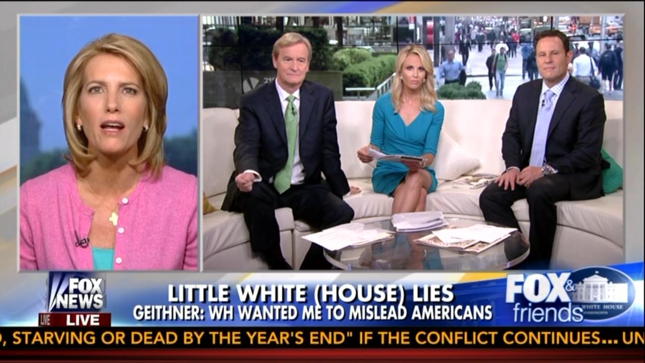 Appearing as a guest on Tuesday's Fox and Friends on FNC, conservative talk radio host Laura Ingraham asserted that former Obama administration Treasury Secretary Tim Geithner should have resigned when he was asked to lie about the role Social Security plays in the federal government's fiscal problems.