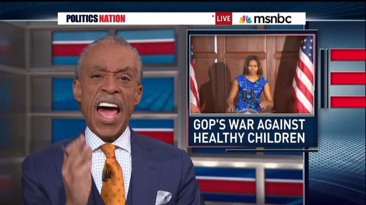 On Thursday's PoliticsNation on MSNBC, host Al Sharpton led his show bellowing about a "war" against First Lady Michelle Obama's school lunch nutrition efforts as he mocked Republicans for wanting to allow financially struggling school districts to delay implementing nutrition standards.