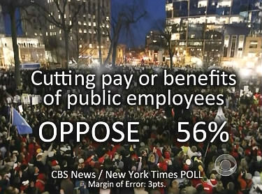 KATIE COURIC: Now to those protests in Wisconsin over plans by the Republican Governor to cut the compensation of public employees and limit their right to negotiate with the state as a group -- which is known as collective bargaining. In a CBS News/New York Times poll out tonight, 56 percent of Americans say they oppose cutting the pay and benefits of public workers to reduce state budget deficits and 60 percent oppose taking away collective bargaining rights. More from Dean Reynolds.
