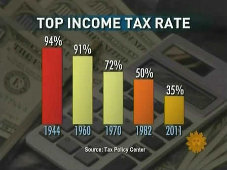 Reporter Seth Doane lamented the declining top tax rate: “It declined slowly through the '60s and '70s until 1982 under Ronald Reagan when it fell to 50 percent, eventually working its way down to the current rate of 35 percent.”