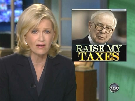 “Billionaires on notice,” ABC anchor Diane Sawyer teased Monday’s World News in trumpeting, as did CBS and NBC, a New York Times op-ed by liberal billionaire Warren Buffett. Sawyer heralded Buffett’s quest: “Is it time for the mega-rich to pay at least the same tax rate as their secretaries? And if they did pay their fair share, would it fix America's schools or roads?”