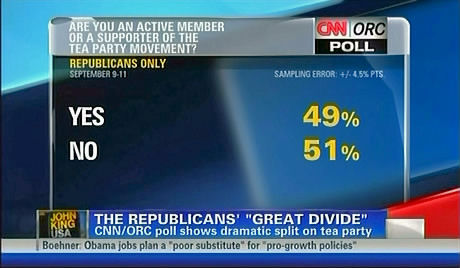 Our new CNN/ORC poll out tonight shows a fascinating divide. A Republican Party split smack right down the middle between those who support the Tea Party and those who don't. Look at this. Forty-nine percent of Republicans and independents who lean Republican either support the Tea Party or are active members. Fifty- one percent of these voters either have no feelings of the Tea Party or oppose the movement.