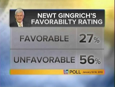 There will be more to the case to be made against Newt Gingrich as a possible nominee by Republican office holders, especially those in the House and the Senate, across the country. And here’s why: From the latest Fox News/Opinion Dynamics poll – these numbers will change as they do from time to time – this is favorability versus unfavorability. Mitt Romney, 45 favorable, 38 unfavorable. Ron Paul, 35 favorable, 40 unfavorable. Rick Santorum, 31 favorable, 34 unfavorable. Newt Gingrich 27 percent favorable, 56 percent unfavorable. Believe me, Republicans in Congress will be terrified to run with this man for fear they will lose the House and the Senate. They will begin to do what they can to try to defeat him because they fear he can't win the election and, moreover, he may drag many down to defeat with him. He has a lot of work to do to change their minds. I'm not sure he can.