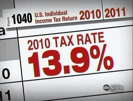 DAVID MUIR: ...That 2010 tax return and the estimate for 2011, showing Romney earned more than $42 million over two years solely from investments. Romney did not have a job. Paying about $6.2 million in taxes over two years. His tax rate? In 2010, about 13.9 percent, perfectly legal under the current tax code which allows Americans to pay a much lower rate, a capital gains tax, when their earnings come from investments, and not a job.