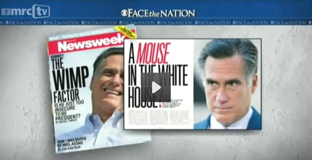 A left-wing writer for a liberal magazine wrote an article trying to undermine the Republican presidential candidate, a cover story which featured an insulting characterization. But instead of treating the attack as irrelevant, CBS’s Face the Nation decided to showcase it. “I just got a copy of the Newsweek cover that’s going to be hitting the newsstands tomorrow that calls you a ‘wimp,’” reporter Jan Crawford told Mitt Romney in Israel. “Have you seen this?”