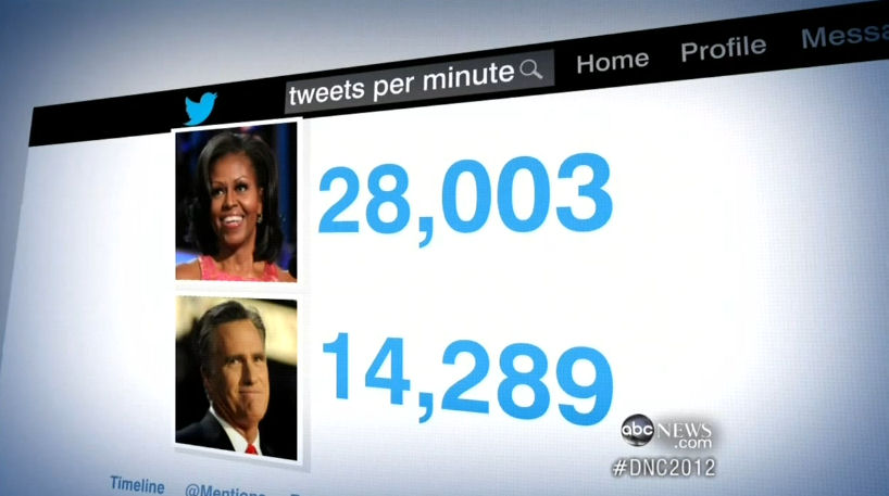 Muir also gushed about First Lady Michelle Obama “electrifying the crowd here and, apparently, someplace else: Twitter. Nearly twice as many tweets per minute as Republican presidential candidate Mitt Romney. 28,000 tweets per minute for the First Lady, in fact, and, apparently, it wasn’t just her speech, it was also her dress...”