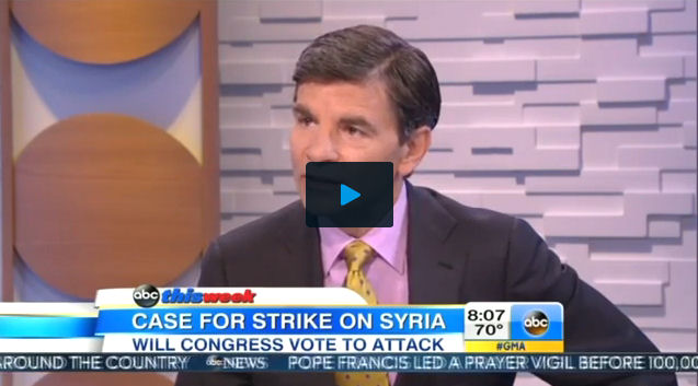 Yet on Sunday’s Good Morning America, Stephanopoulos quoted Obama: “Listen to what he said Friday night in Russia: ‘I did not put this’ – this resolution – ‘before Congress as a political ploy or symbolism.’” Later, on This Week, he again left off the very relevant “just” as he mis-characterized Obama back to White House Chief-of-Staff Denis McDonough: “He said his call to Congress was not a political ploy or symbolism.”