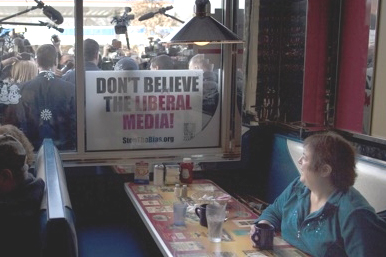 Talk about irony. The front page of today's Washington Post featured a large photo of a Rick Santorum rally in New Hampshire, with two of MRC's "Don't Believe the Liberal Media!" signs front and center. That's nice, but perhaps the Washington Post should read its own front page more often.