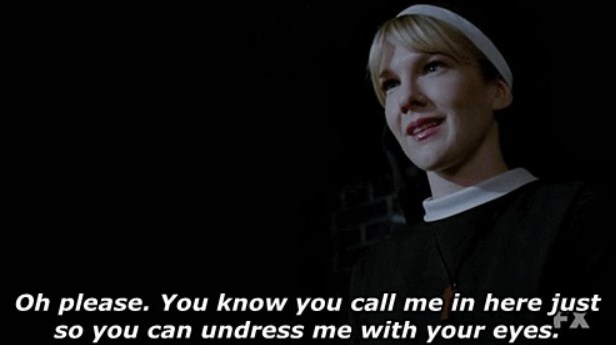 In episode two, a nymphomaniac patient named Shelley taunted a psychiatrist: “I saw you flirting with Our Lady of Perpetual Virginity. Want to see my candy apple?” Later, the psychiatrist hired a prostitute who dressed up in a nun’s habit. In an attempted exorcism, a demon-possessed man declared that Lange’s Sister Jude had performed oral sex on 53 men before becoming a nun. “You were the town pump, weren’t you, Sister?”