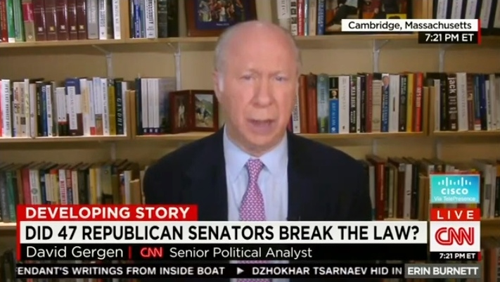 Enter CNN’s David Gergen, who, despite working for the Nixon, Ford, and Reagan Administrations, announced on Tuesday night's Erin Burnett OutFront that he “can't remember an instance in which such a letter has been sent. This much of an interference has been launched from the halls of Congress with the President in the midst of negotiations.”