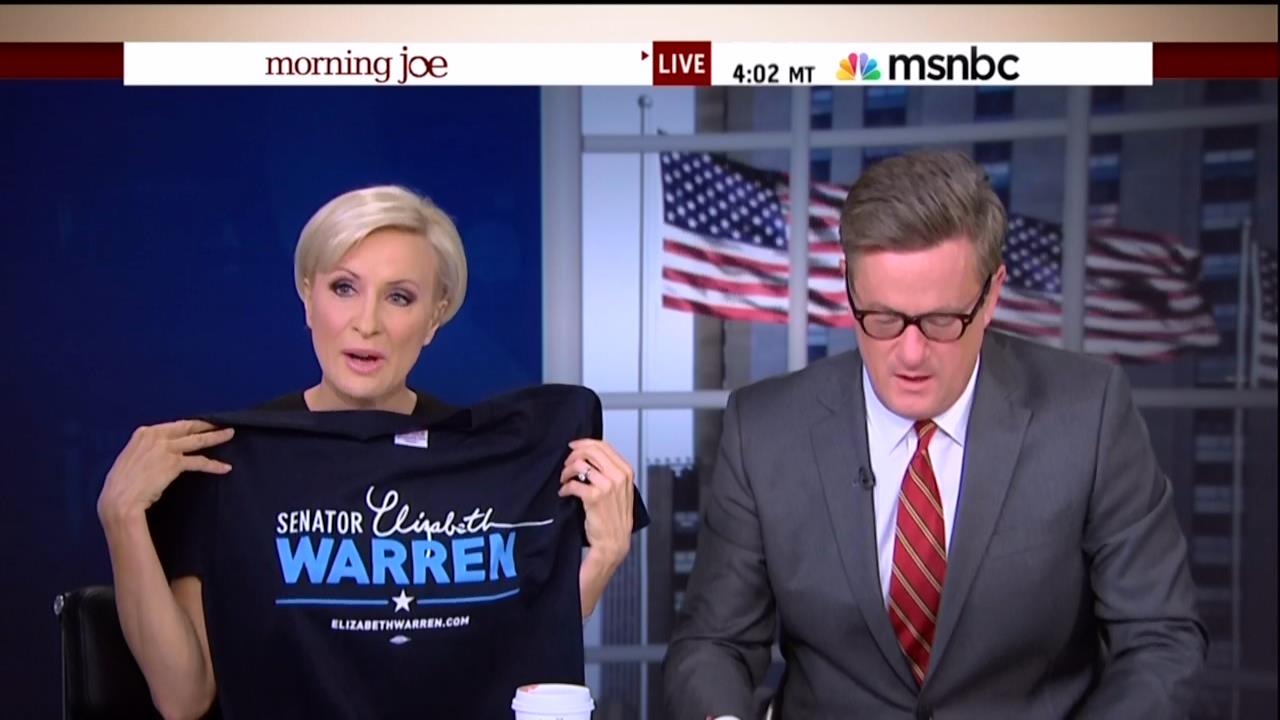 Veteran media watchers are well acquainted with the fact that the media in general and MSNBC in particular are cesspools of leftist talking points. Despite this, news anchors at least try not wear their politics on their sleeves, except for Morning Joe’s Mika Brzezinski, who literally did just that by showcasing a pro-Elizabeth Warren t-shirt she received from former Obama Counselor to the Secretary of the Treasury Steven Rattner.
