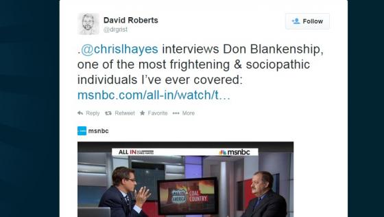 Roberts, a staff writer at the liberal environmental website Grist.com, and self-described “climate hawk,” tweeted out a nasty attack on Don Blankenship on Oct. 9. Blankenship is the former Chairman and CEO of Massey Energy Co.