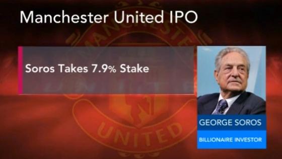 Soros’s $25 billion Fund Management Group bought 7.9 percent of Manchester United’s Class A shares. The English soccer club went public in August,