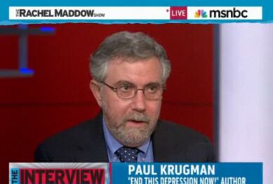 The Rachel Maddow show on MSNBC Monday night featured New York Times columnist Paul Krugman. During the supportive chat, Keynesian Krugman again asserted that more federal spending would have headed off what he calls our current Depression: