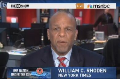 On MSNBC's The Ed Show Monday night, New York Times sports columnist William Rhoden defended NBC sportscaster Bob Costas's controversial comments, made during halftime of an NFL game Sunday night, on the murder-suicide committed by Kansas City Chief player Jovan Belcher, even agreeing to the idea that the NFL commissioner try to ban players from owning guns.