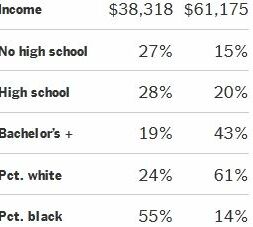 The paper even made up a large class-and-race-based graphic for the story, with explanatory text: "A New York Times analysis of homicides and census data in Chicago compared areas near murders to those that were not. Residents living near homicides in the last 12 years were much more likely to be black, earn less money and lack a college degree."