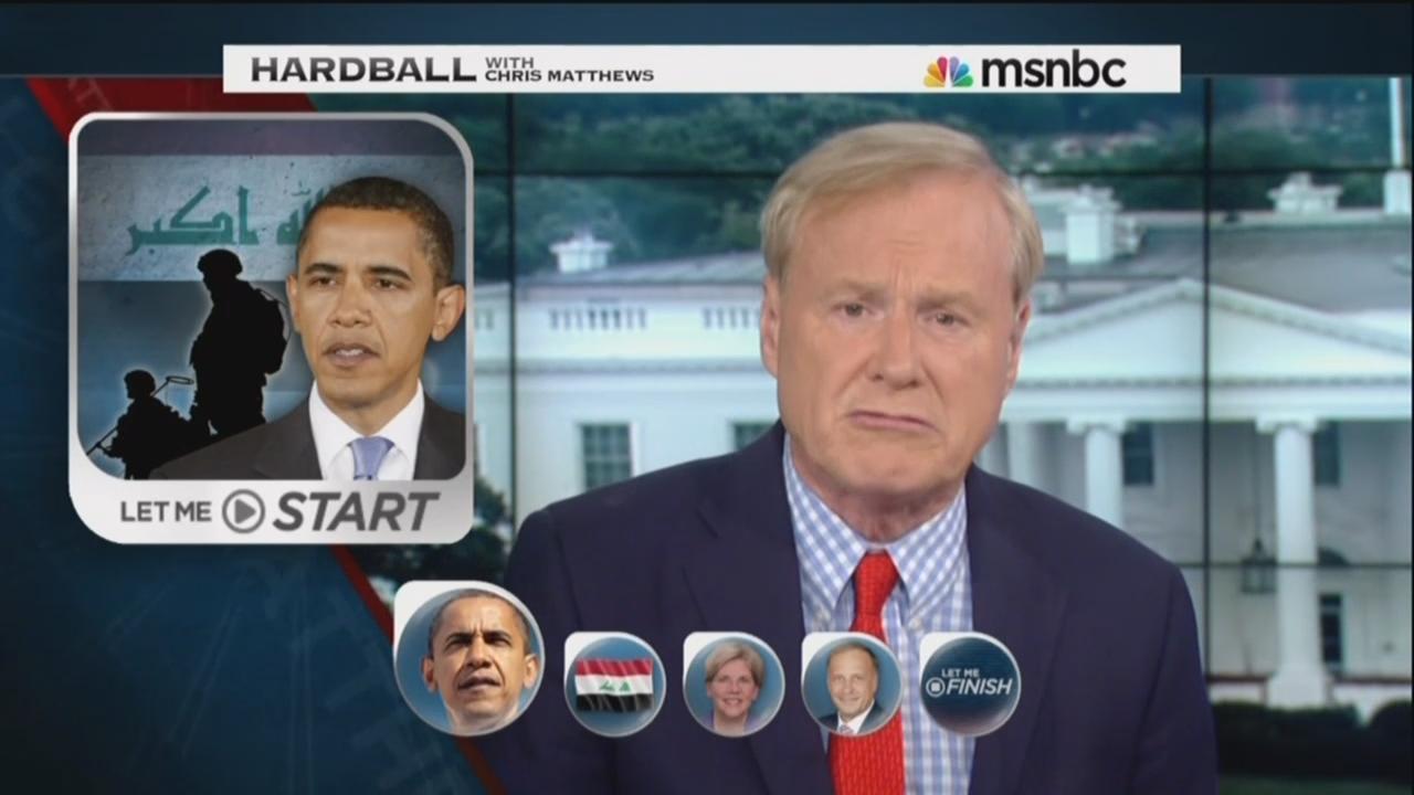 CHRIS MATTHEWS, host: Good evening. I'm Chris Matthews in Washington. Let me start tonight with us getting back into Iraq. Question, do you as an American citizen of this country think we should be doing this–getting back into the Iraqi fighting this time in the midst of a civil war? Do you think the president has the constitutional and or the moral authority to do this? I asked these questions tonight because today, this afternoon President Obama who won the presidency by opposing the decision to take the United States into Iraq said he was taking us, if only by a few measured steps, back into that country's civil war. Yes, he is. The president didn't direct air strikes against the insurgent group known as ISIS which is fighting its way toBaghdad. Yet he did direct a shipment of intelligence capabilities to Iraq to identify what he called potential targets for such strikes. He did direct hundreds of U.S. advisors to aide the Iraqi government right now. The president set no political preconditions for this American engagement. While he did, of course, urge President Maliki to form a more inclusive government saying we'll send him initial aid nonetheless, no matter what he does or doesn't do. So the big question tonight for all of us watching and here on this program is under what constitutional or moral right are we inching our way into an Iraqi civil war based on religion? Is this what the American people really want? Why, will someone tell me, do the television networks–all of them, it seems–and newspapers continue to accept the discredited voices of the very people who sold us–using every trick of propaganda–into invading and occupying Iraq in the first place? All those people want is what they wanted from the start–as massive U.S. military bastion planted permanently in the Middle East with an armed reach into every country in the region which fails to march to the our orders here in America. They wanted us to knock off Saddam Hussein, Gadhafi, they want us to join the fighting in Iraq, send arms to Syria, bomb Iran, and they will not stop until we are up to our necks in the Mideast quick sand.
