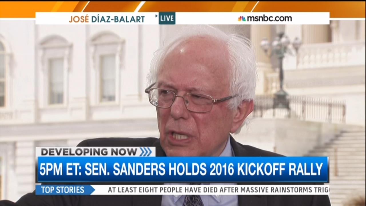 STEVE KORNACKI, host of Up: Well, Jose, I think the basic goal here if you had to thin it down would be to emerge as the chief rival to Hillary Clinton in the race for the Democratic nomination. When you look at it from that standpoint, when you put aside, you know, the bottom line odds of Bernie Sanders becoming president in 2017 are not very good. But when you look at that goal of a one-on-one race with Hillary Clinton, of a contrast between Sanders and his brand of economic populism with Hillary Clinton and everything she represents, the odds of him getting that are not actually that bad. I think he’s actually fairly well positioned on the Democratic side at least potentially to have a shot at that.