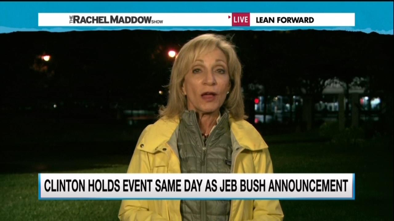 9:45 p.m. EasternRACHEL MADDOW, host: Seeing Hillary Clinton running, talking about her husband's presidency, talking about her husband as my husband, talking about the Clinton presidency and the Obama presidency as two essentially twin experiences with Democratic leadership which she wants to build on. On the same day that Jeb Bush is running as if his last name is not Bush, not in the logo and not in the campaign website and not in his announcement today. Is this a contrast that we expected from Secretary Clinton?