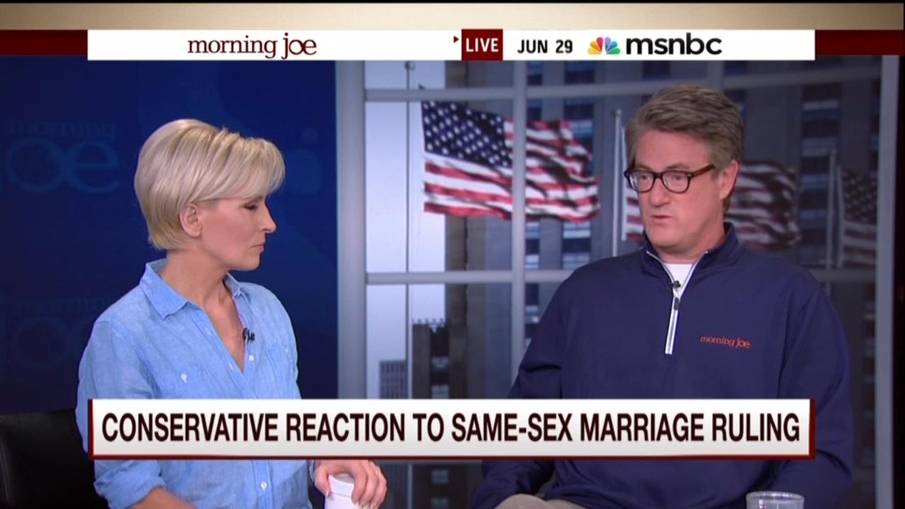 Toward the end of the segment, the Morning Joe co-host suggested that both sides need to show grace following the Court’s decision: “[B]oth sides need to show grace. And the winning side needs to show grace as well as the losing side. You cannot call a Republican a bigot in 2015 for taking the same exact position that President Obama took in 2012.”