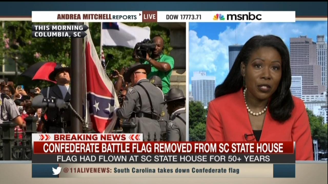 On July 10, following the removal of the Confederate battle flag from Capitol grounds in South Carolina, a panel discussed the historic event on MSNBC's Andrea Mitchell Reports. Guest host Craig Melvin brought Pulitzer Prize winning author Isabel Wilkerson to the program. He asked the author to put the removal of the flag into “historical perspective.” Wilkerson remarked that we are “witnessing today, perhaps, truly the beginning of the end of the Civil War.”