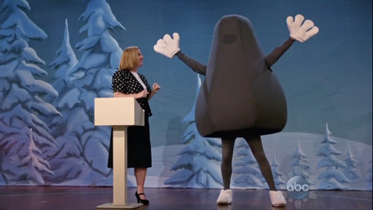 -Teacher: In our past shows, we've had visits from Santa, Rudolph, and little-people elves, who, with gusto, threw themselves into the crowd to be passed around. However, a new state law was just passed called "Kathy's rule," which prohibits any religious, spiritual, or gender-y connotations in state-funded children's theater. So this year, please welcome the pan-cultural seasonal entity.