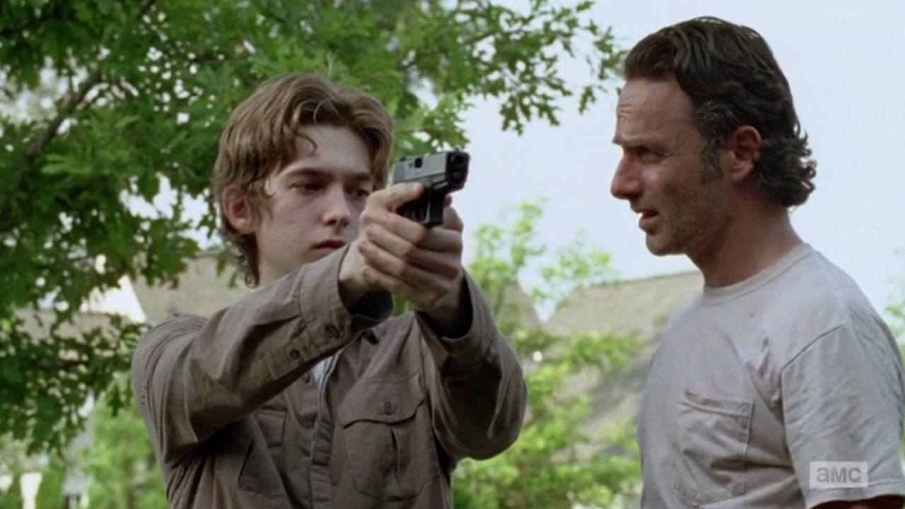 The scene in question shows Rick Grimes (Andrew Lincoln) teaching Ron Anderson (Austin Abrams) how to shoot. Whether or not this is a good idea given Ron’s grudges against Rick and Carl Grimes (Chandler Riggs) remains to be seen, but at least Rick gets the lesson right. Watch for yourself.