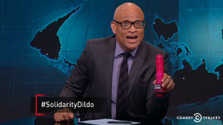 Wilmore went on to say, “we are in solidarity with you UT,” as he pulled out a pink “patented Nightly Show” dildo. Wilmore then instructed viewers to buy a dildo, attach a Nightly Show logo to it, and take a picture with it and include #solidaritydildo to lend support for the #cocksnotglocks movement on UT campuses. All of the dildo pictures will then be released next year when students will supposedly be marching in protest against the law.