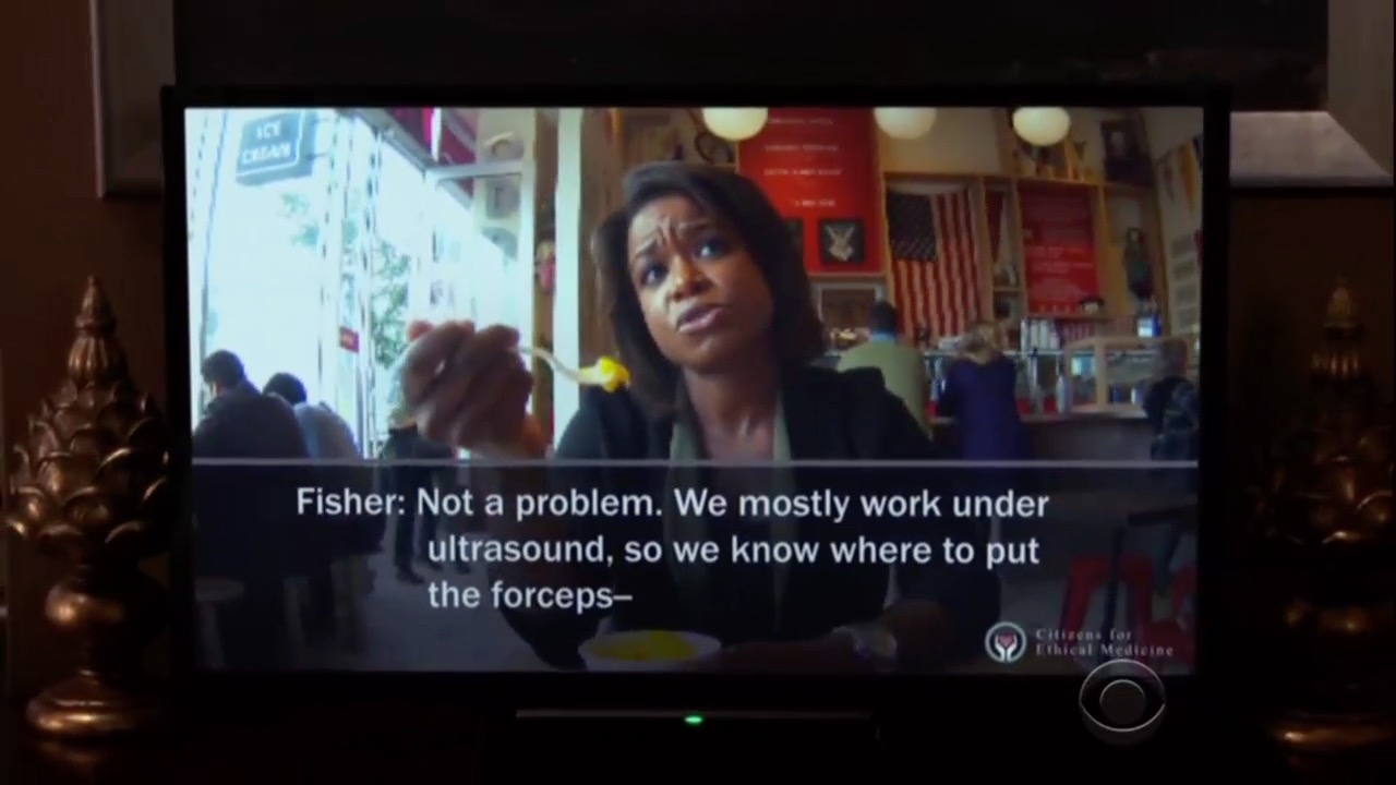 The Good Wife episode “Restraint” was remarkable in how closely it mirrors the real Planned Parenthood videos, although they don't mention them by name. In the video below, you’ll note the similarities; an abortionist cavalierly discusses selling baby parts while eating frozen yogurt – in the Planned Parenthood videos, it’s over salad. The fictional company that produced the videos is called Citizens for Ethical Medicine, the real one is Center for Medical Progress. The price – $100 per specimen – is about the same, discussion of hearts and livers is the same, talk of moving the baby into breach position to better preserve its organs for harvest is the same, and talk of “squashing” or “smushing” is pretty much the same.