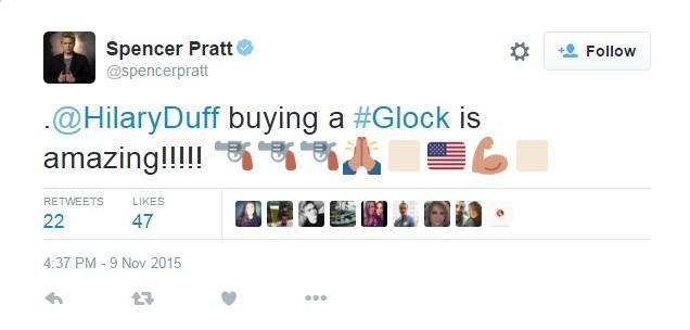 Former Hills star Spencer Pratt, who has his own gun collection with wife Heidi Montag, also congratulated Duff for her purchase: