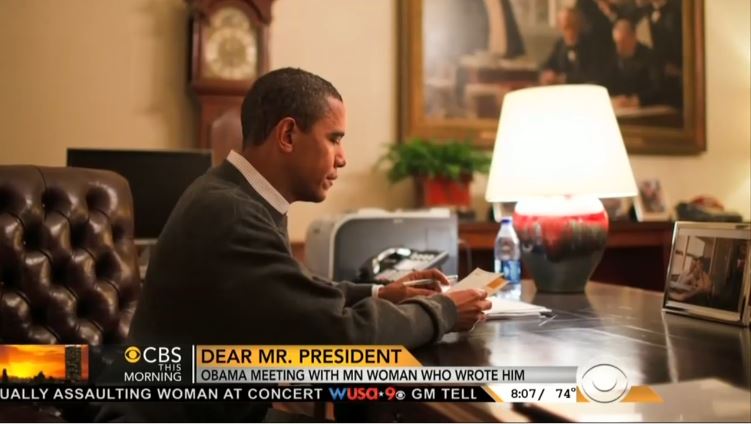 [ON-SCREEN HEADLINE: “Dear Mr. President: Obama Meeting With MN Woman Who Wrote Him”]