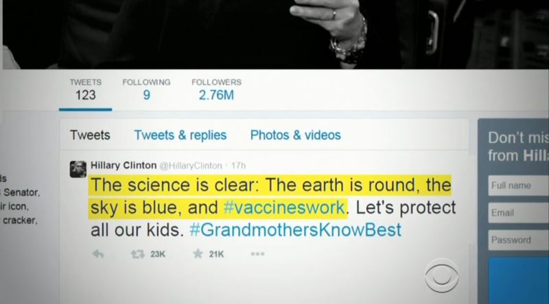 Cordes proclaimed that: “The mixed messages left an opening for possible Democratic candidate Hillary Clinton who tweeted, ‘The science is clear: the Earth is round, the sky is blue, and vaccines work.’ Adding, ‘Grandmother knows best.’”