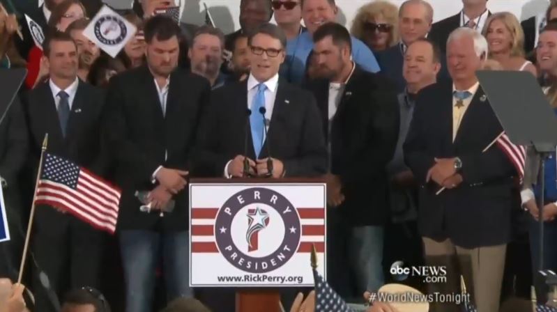 Former Texas Republican Governor Rick Perry announced a second presidential campaign on Thursday afternoon, but viewers on the Thursday evening network newscasts may have missed the news altogether if not careful since the “big three” of ABC, CBS, and NBC gave Perry less than a minute and a half of combined airtime.