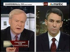 The Republican Attorney General of Virginia, Ken Cuccinelli, accomplished what many others have failed to do and that is stay calm and collected in the midst of Chris Matthews' increasingly absurd charges, that even bordered on accusations of racism. Invited on Thursday's Hardball, to discuss a possible repeal amendment to the Constitution, Cuccinelli faced down a series of Matthews distortions as the Hardball host, at varying times, accused him of wanting to start another Whiskey Rebellion, questioned if he wanted to overturn the Civil Rights Act and charged that he was playing to "The old Johnny Rebs" and "Civil War buffs" in his state.
